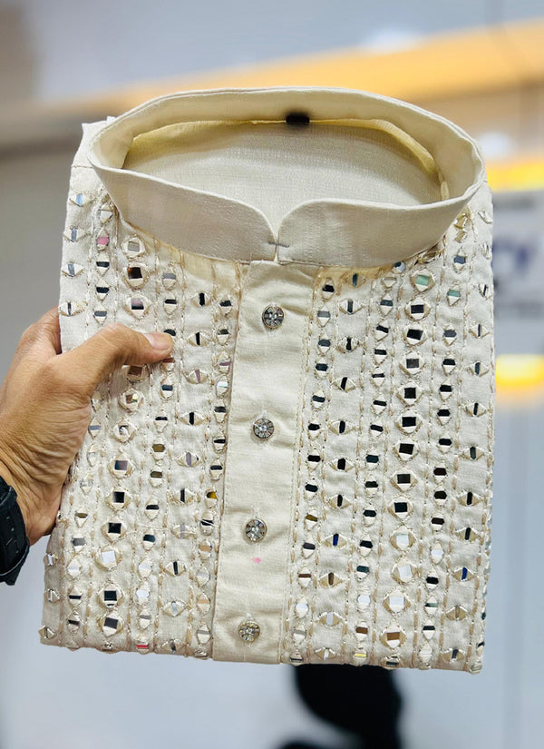 Prazu Fashion Off White Soft Silk Real Mirror Work KurtaAbout the Product: GENDER : male Colour : White Work/Pattern : Mirror Work Fabric : Silk Ne...