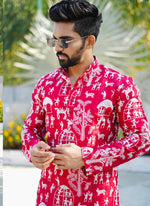 Prazu Fashion Red Lucknowi Silk Kurta With PajamaAbout the Product: GENDER : male Colour : Red Work/Pattern : Lacknowi Fabric : Silk Neck Line : Co...