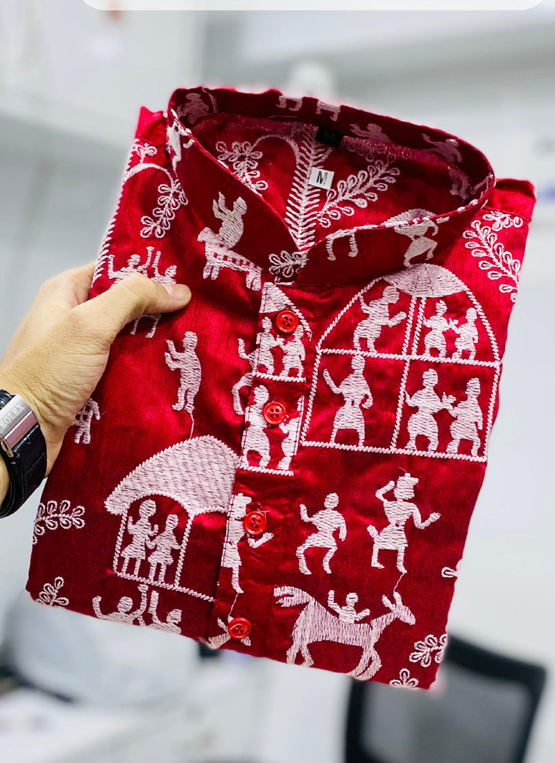 Prazu Fashion Red Lucknowi Silk Kurta With Pajama