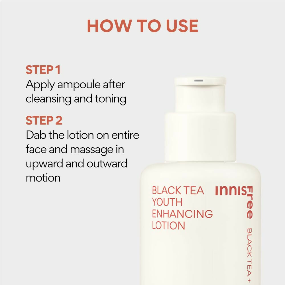 • Innisfree Black Tea Youth Enhancing Lotion is a radiant lotion formulated with Reset concentrate, that helps to enhance firm and radiant looking skin.