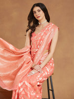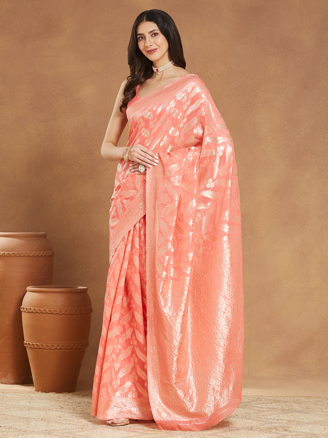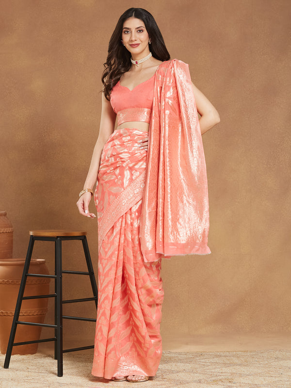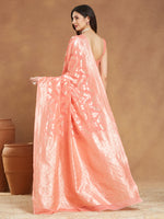 Janasya Peach Silk Blend Floral Jacquard Saree