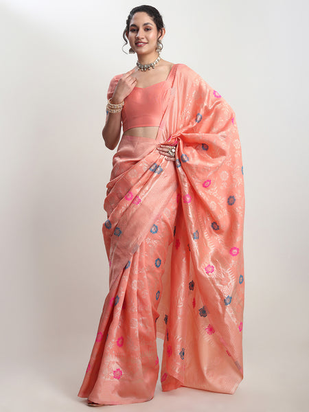 Janasya Peach Silk Blend Floral Jacquard Saree
