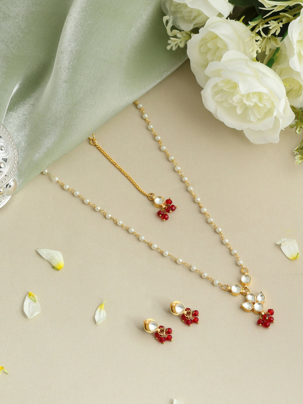 Ruby Raang Maang Tikka With Necklace And Earrings Set - One Size