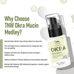 Radiant, supple skin is within your reach with the remarkable power of OKRA. This luxurious Okra Mucin Medley harnesses the potent combination of Okra Mucin, Gotu Kola, and Lotus Root Extract to deeply hydrate, brighten, and firm your skin. Squalene provides long-lasting moisturization and skin repair, while Hyaluronic Acid plumps and enhances elasticity, leaving your complexion looking and feeling its absolute best. Reach new heights of skin health and beauty by getting unparalleled benefits from nature's finest ingredients in this innovative Okra Mucin Medley.