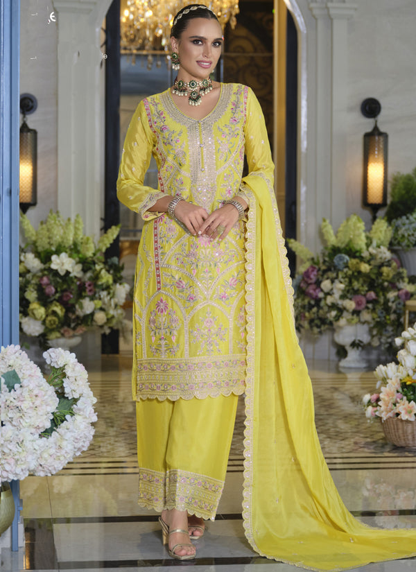 Vegaa Fashion Yellow Chinon Silk Embroidered Designer Palazzo Suit