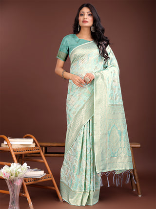 Astita Elegant Sea Green Linen Cotton Saree with Silver Zari - Perfect Blend of Comfort & Charm