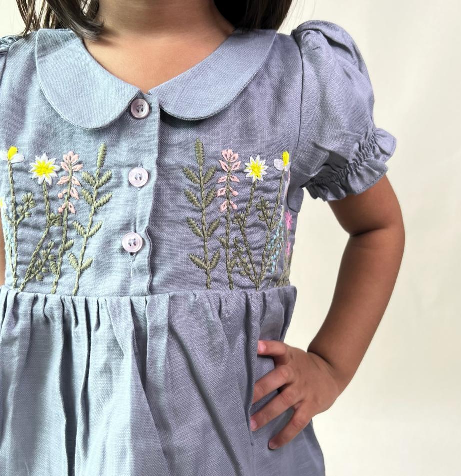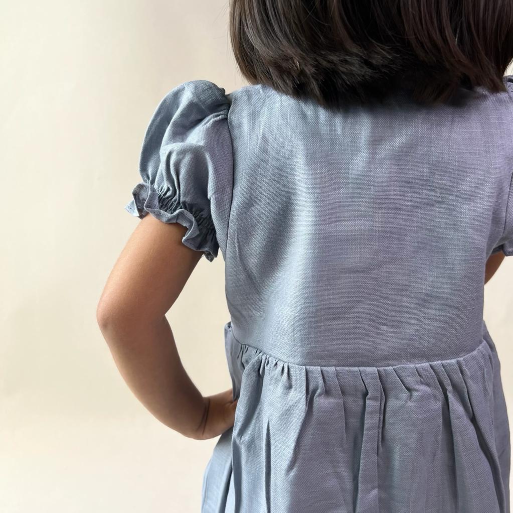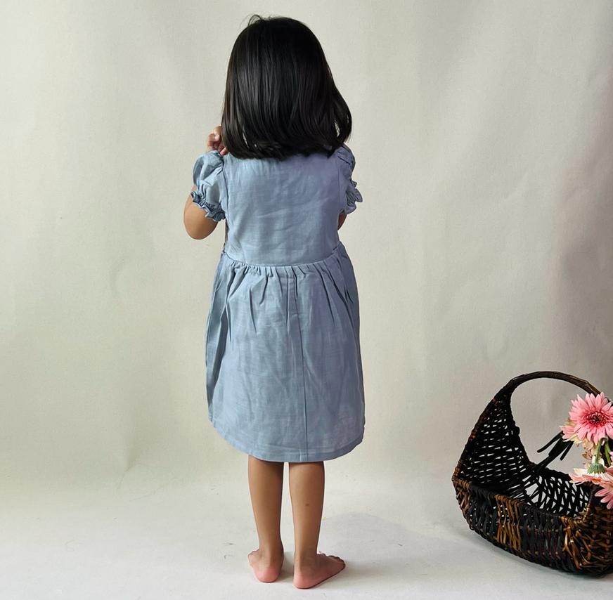 Adorable meets stylish with our grey Peter Pan collar shirt dress! Featuring charming flower embroidery detailing at the yoke and puff sleeves with elasticated hem, this dress is perfect for your little fashionista. The front button panel adds a touch of sophistication to this playful and comfortable outfit.