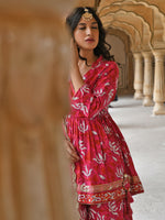 Style your festive look into this beautiful pink printed cotton short kurta and sharara set with organza dupatta. It has all-over floral prints, mandarin collar with gota detailing and 3/4 sleeves with tie-ups and tassels. The set is paired with solid pink organza dupatta featuring lace detailing at the borders.