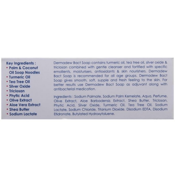 Dermadew Bact Soap contains turmeric oil, tea tree oil, silver oxide, and triclosan combined with a gentle cleanser and fortified with specific emollients, moisturisers, antioxidants and skin nourishers. This soap is recommended for all age groups. It gives a smooth, soft, supple, and fresh feeling to the skin.