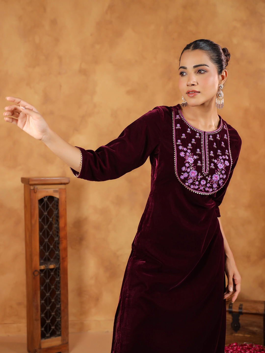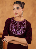 Janasya Wine Velvet Embroidered Kurta & Bottom