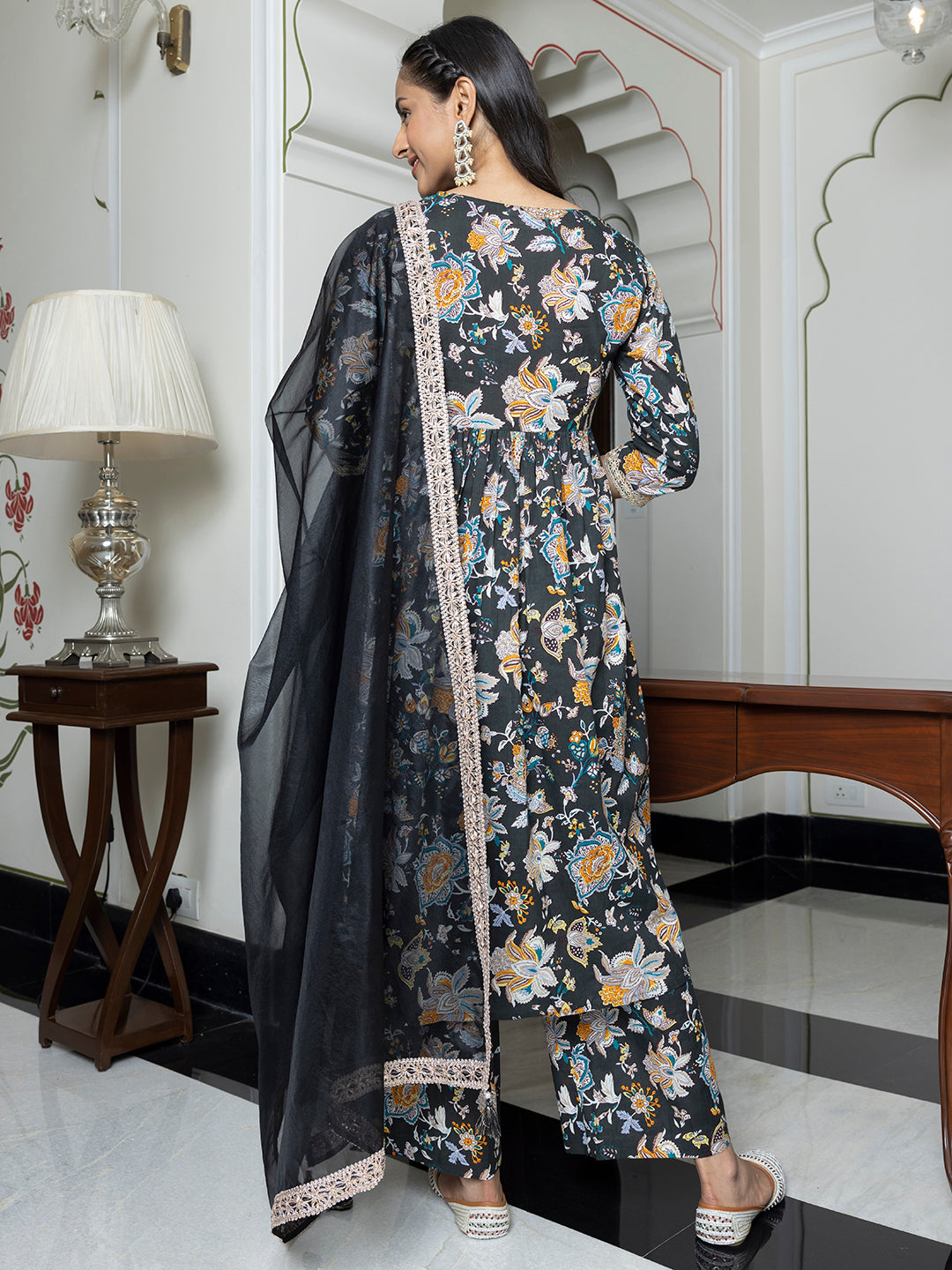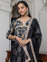 Janasya Women's Black Cotton Embellished Festive Empire Kurta Set