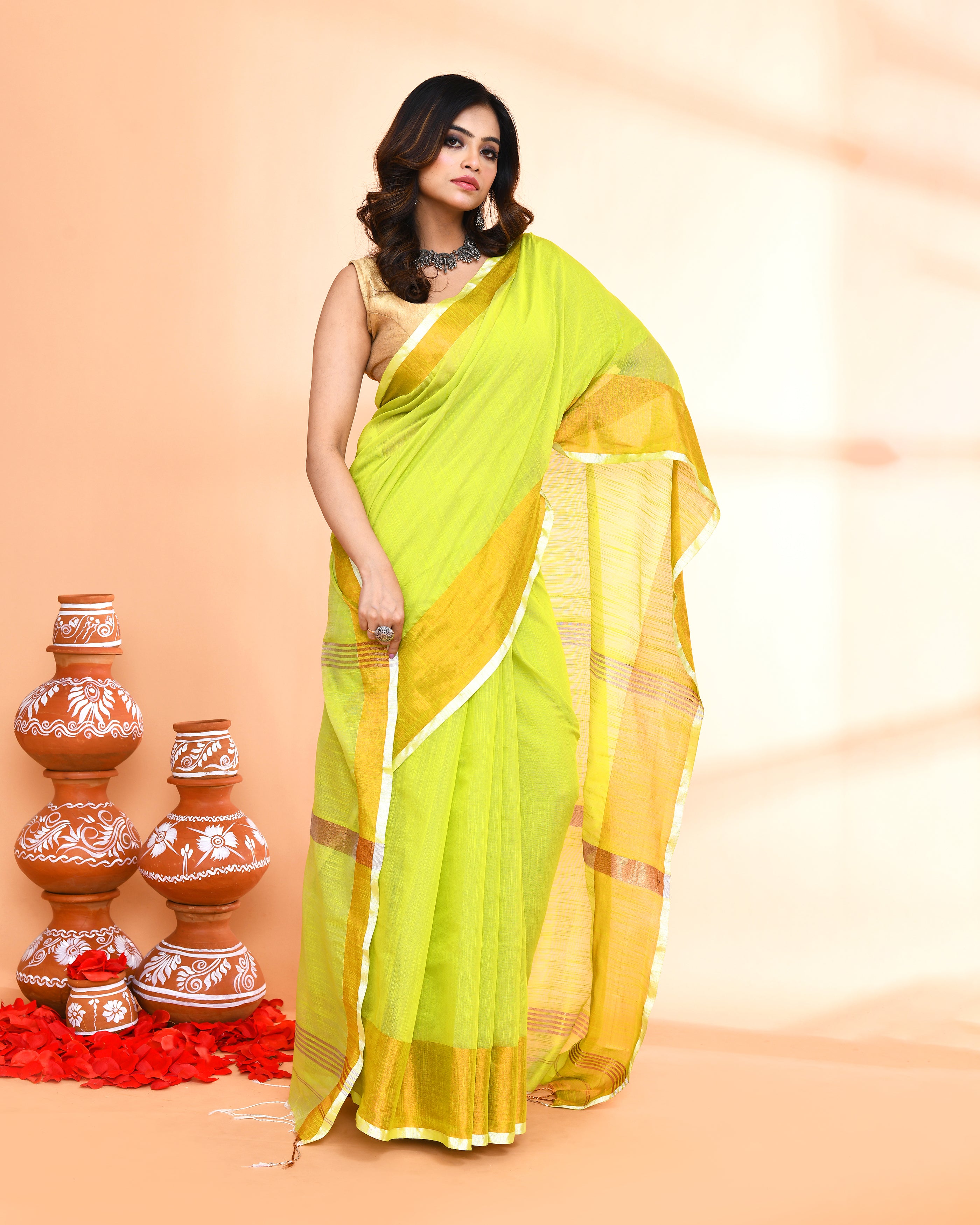 A fresh and vibrant addition to your wardrobes! This saree is crafted in Cotton Handspun that features beautiful shades that will give you zesty vibes! Style this up with minimal jewelry for a fab look!