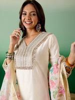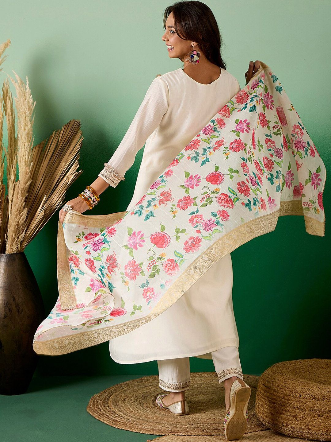 Sangria Off White Floral Embroidered Zari Sequence A-Line Kurta With Trouser & Dupatta - Distacart