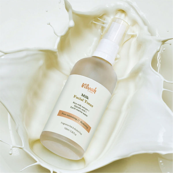 Vilvah Store Milk Face Toner is a skincare product prepared with a blend of Earth Marine Water, Rice Milk Extract, Glycolic Acid, and hydrating components. It comes in a spray format, making it easy to apply directly onto cleansed skin.