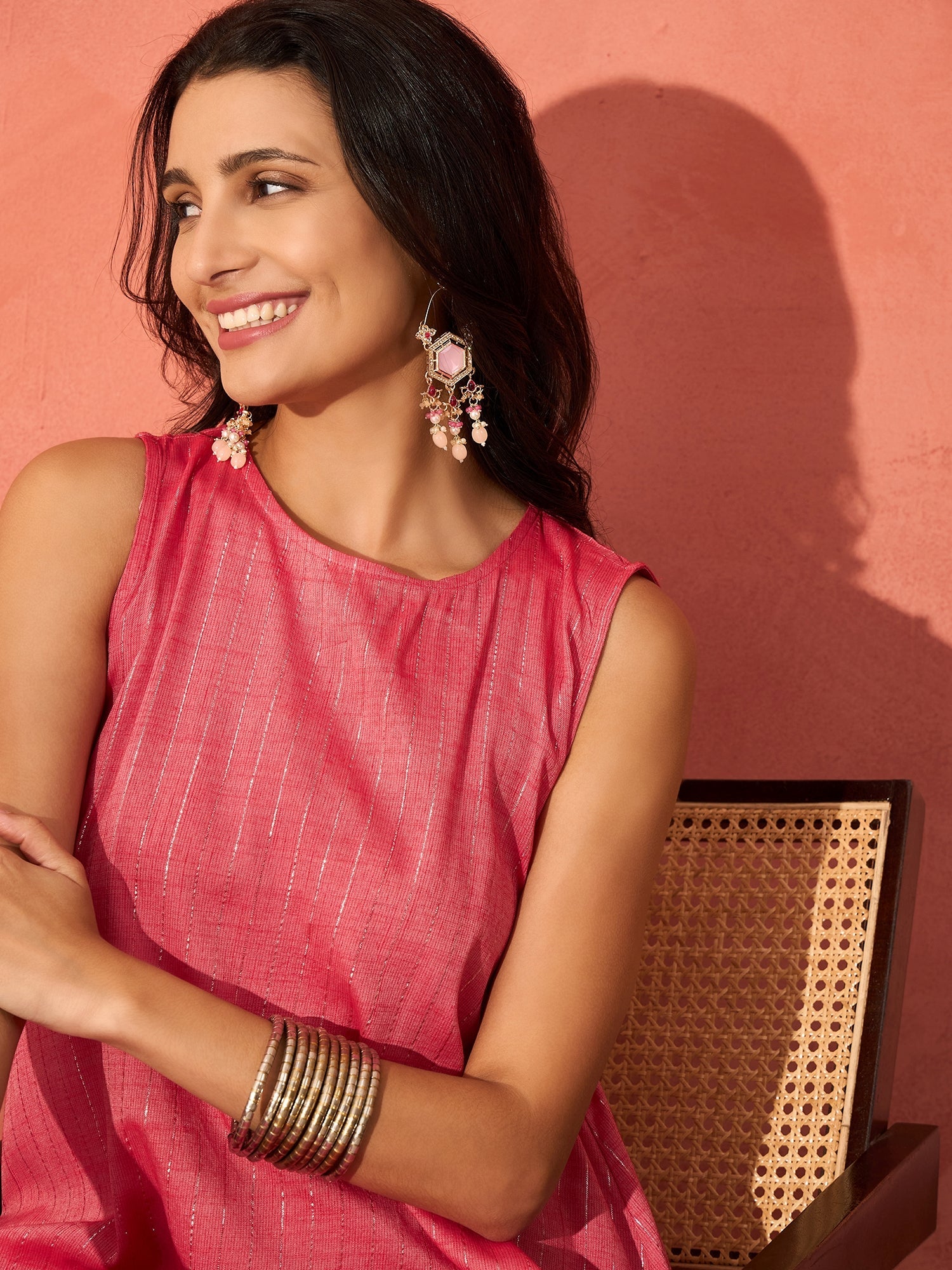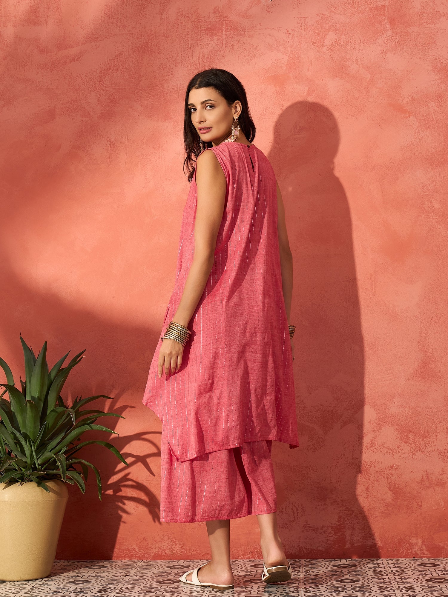 The Red Lurex Short Palazzo Kurta Set is a chic and glamorous outfit that combines traditional Indian elements with a modern twist, perfect for festive occasions and parties. Here€™s a detailed description and styling guide for this set: