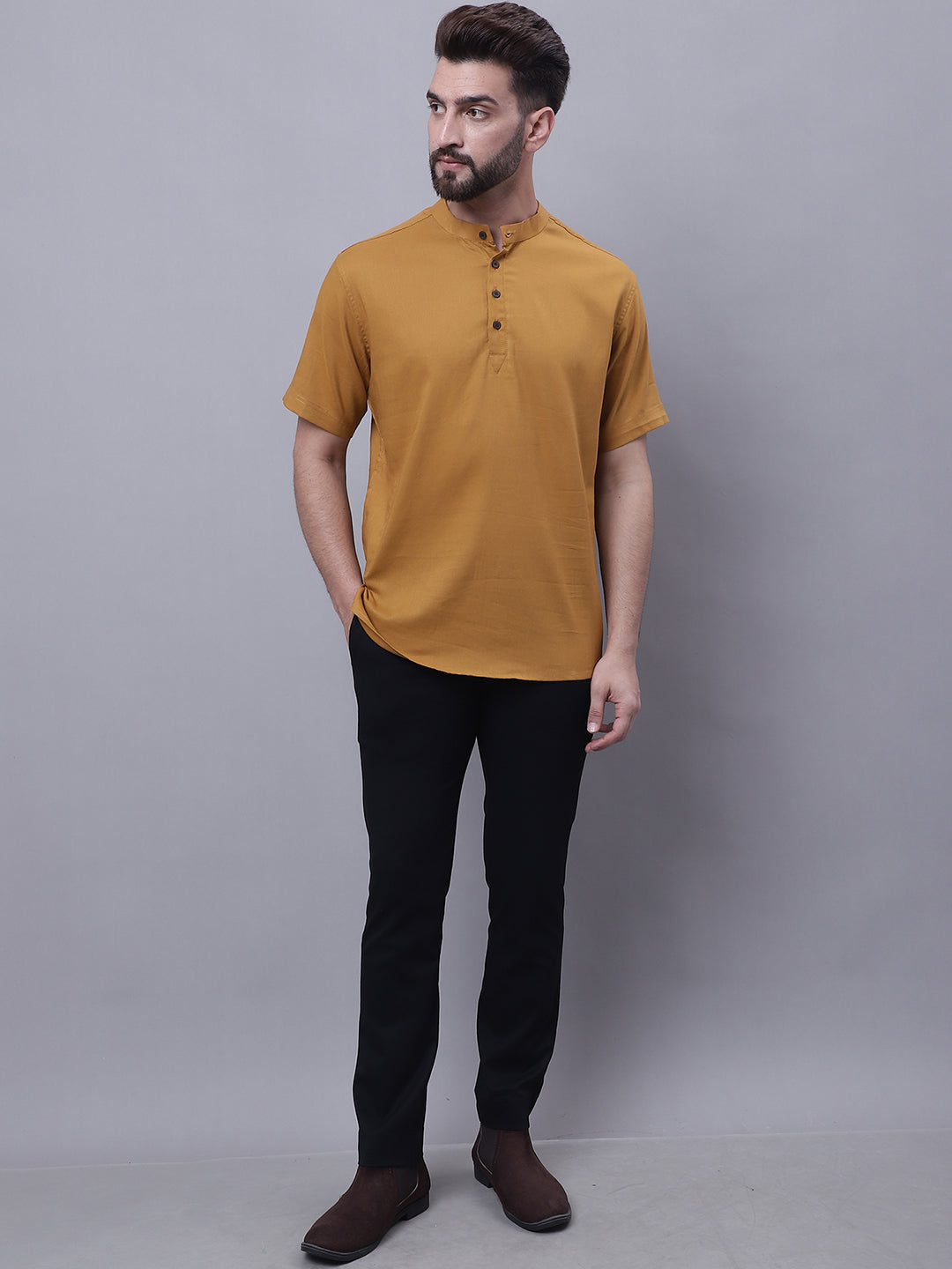 Even Apparels Brown Pure Cotton Short Kurta With Band Collar