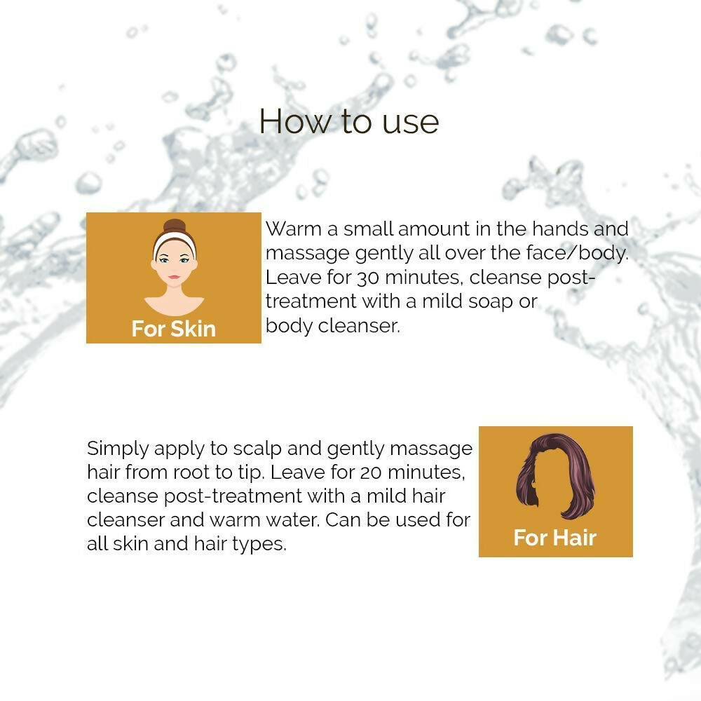 • Pour some oil onto the palm and apply it directly on the skin and rub it well. FOR BODY: Warm an adequate amount of coconut oil organic gently massage all over the body. Leave it for 30 minutes and take a bath with mild soap or body cleanser. FOR HAIR: Apply oil to the scalp, gently massage from root to hair tip. Leave it for 20 minutes & cleanse with a mild shampoo and warm water.