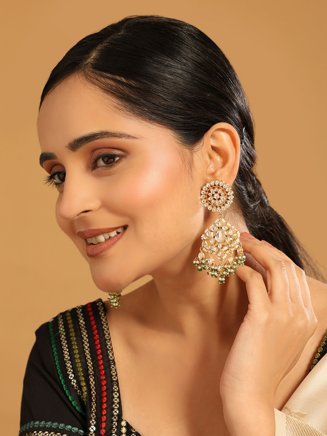 Nuyug 22K Gold Plated Traditional Kundan Studded Contemporary Dangler Earrings with Pearl and Green Bead AccentsAbout the product:22 k Gold-toned, ...