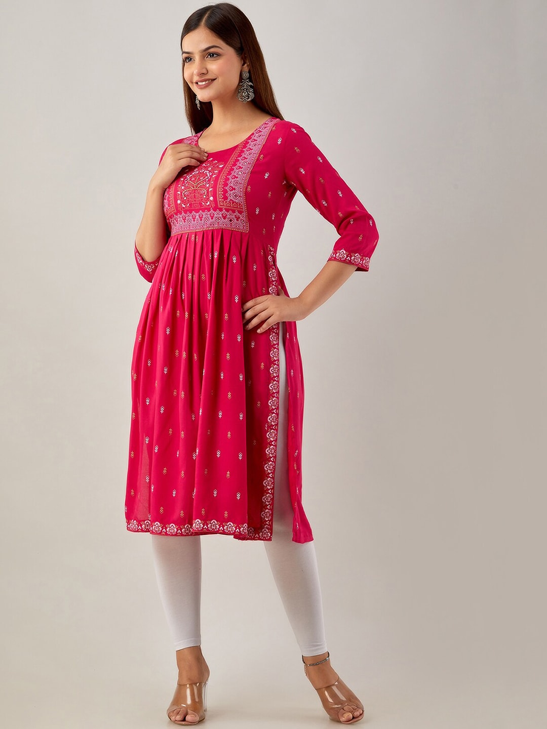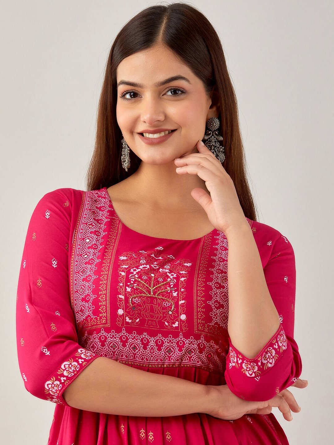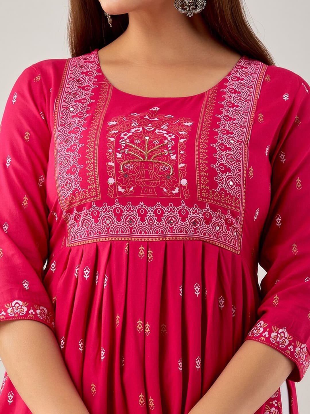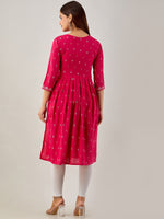 Kalini Ethnic Motifs Printed Mirror Work Kurta Product Details Colour: pink Ethnic motifs printed Round neck Three-quarter, regular sleeves A-l...