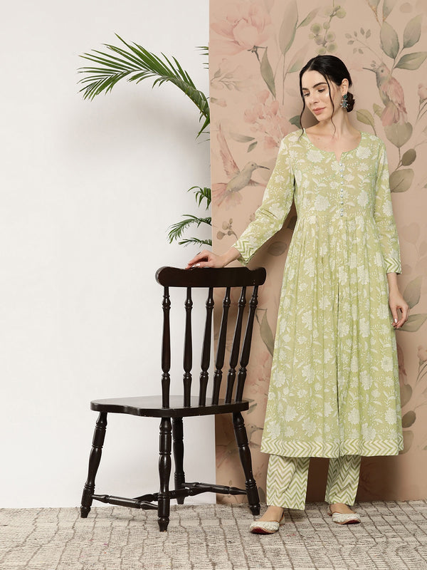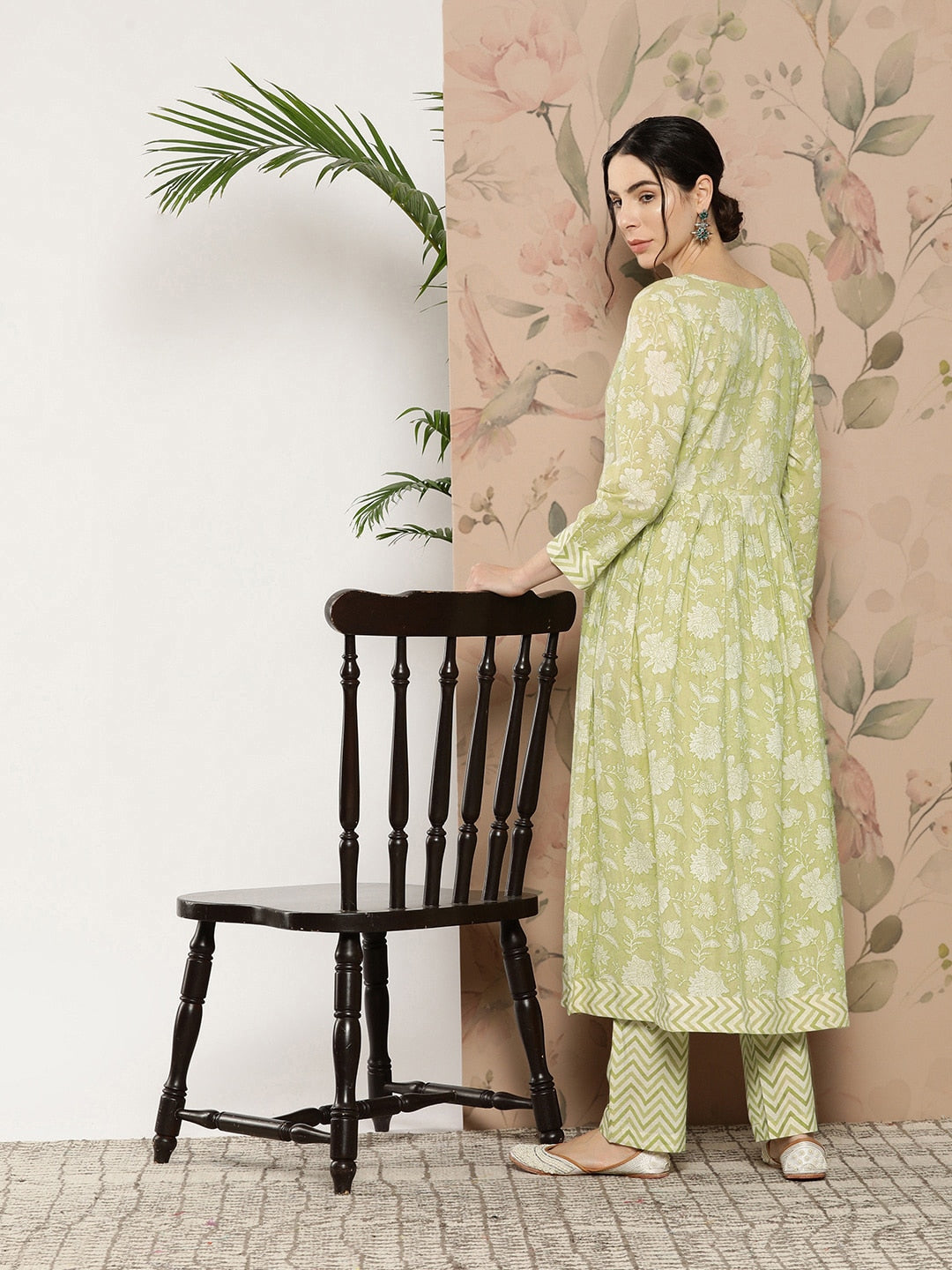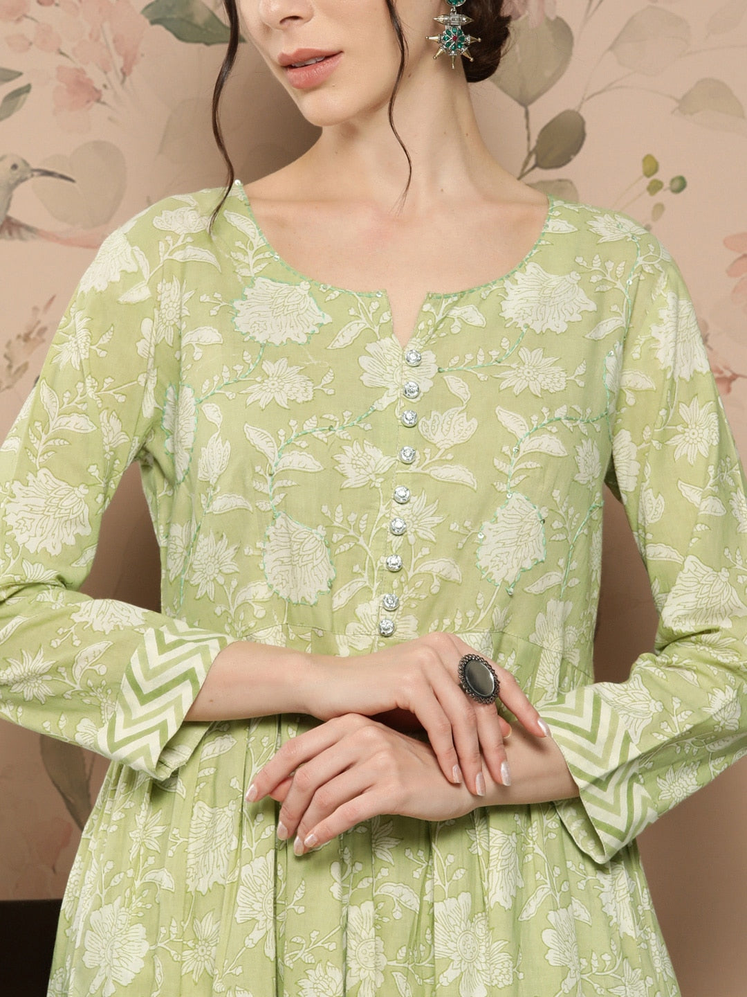 Kalini Ethnic Motifs Printed Thread Work Pure Cotton Kurta With Trousers Product Details Green printed Kurta with Trousers Kurta design: Et...