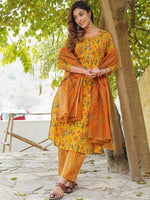 Mustard yellow, green and orange printed Kurta with Trousers & dupatta