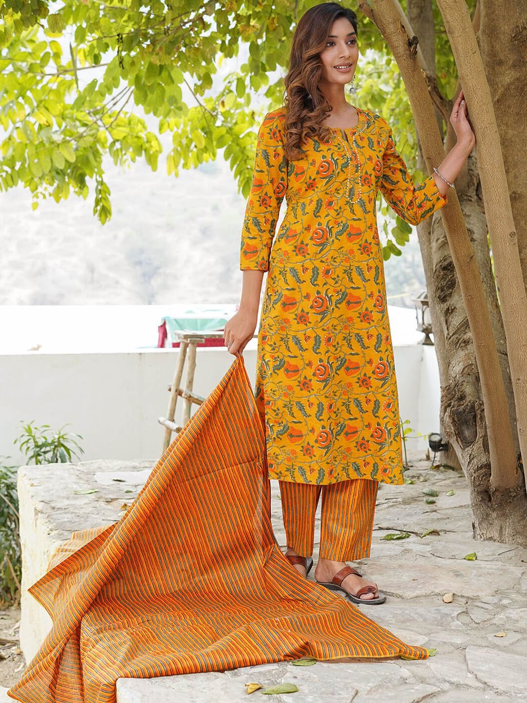 Kalini Floral Printed Gotta Patti Sequined Pure Cotton Kurta with Trousers & Dupatta Product Details Mustard yellow, green and orange printe...