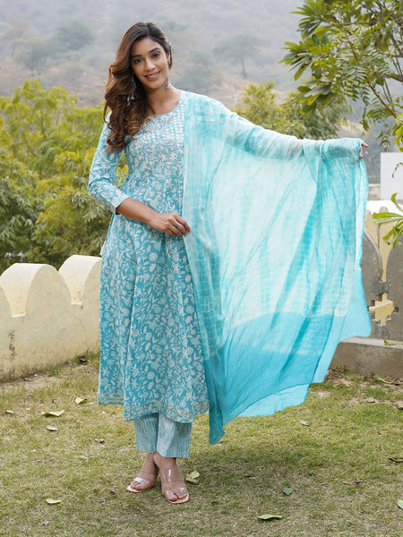 Kalini Floral Printed Regular Mirror Work Pure Cotton Kurta with Trousers & With Dupatta Product Details Blue printed Kurta with Trousers wi...