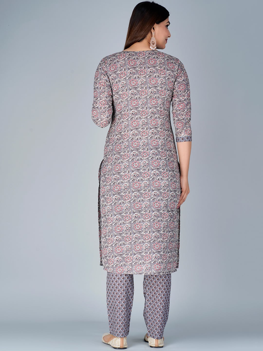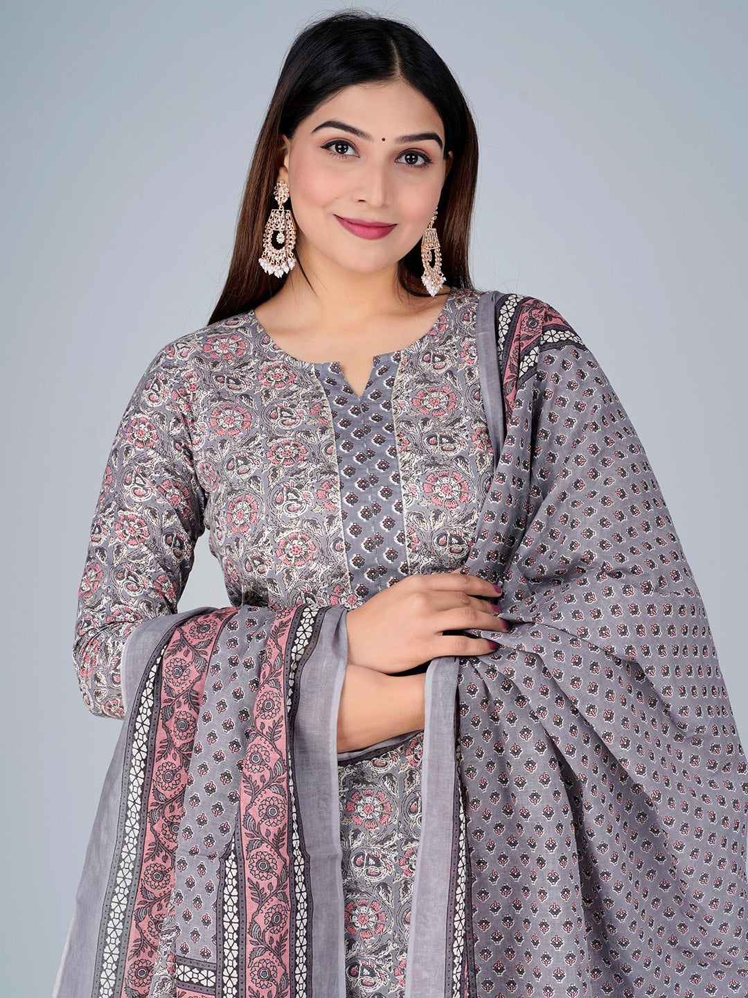Kalini Notch Neck Floral Printed Pure Cotton Kurta with Trousers & Dupatta Product Details Grey, off-white and pink Kurta with Trousers &...