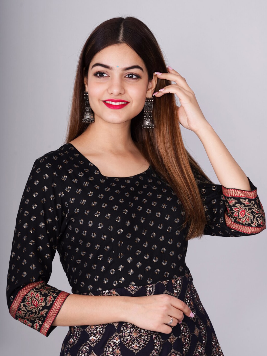 Kalini Women Black Ethnic Motifs Printed Anarkali Kurta Product Details Colour: black Ethnic motifs printed Scoop neck Three-quarter, regular s...