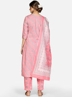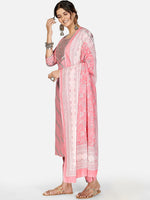 Kalini Women Pink Ethnic Motifs Striped Thread Work Pure Cotton Kurta with Trousers & With Dupatta - Distacart