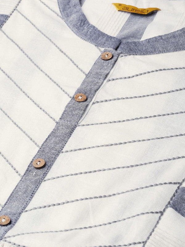 Off-white and navy blue self striped woven maxi dress with tie-up and gathered detail, has a mandarin collar, three-quarter sleeves, hook and eye closure, and flared hem