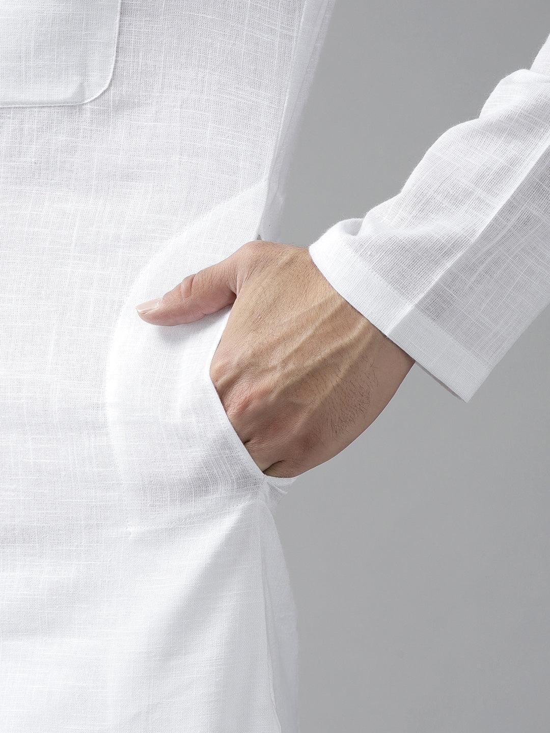 Men's White Cotton Straight Kurta with Linen Effect Modern Collar & Full Sleeves