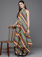 Ahalyaa Women Striped High Slit Kurta with Palazzos - Green Color