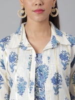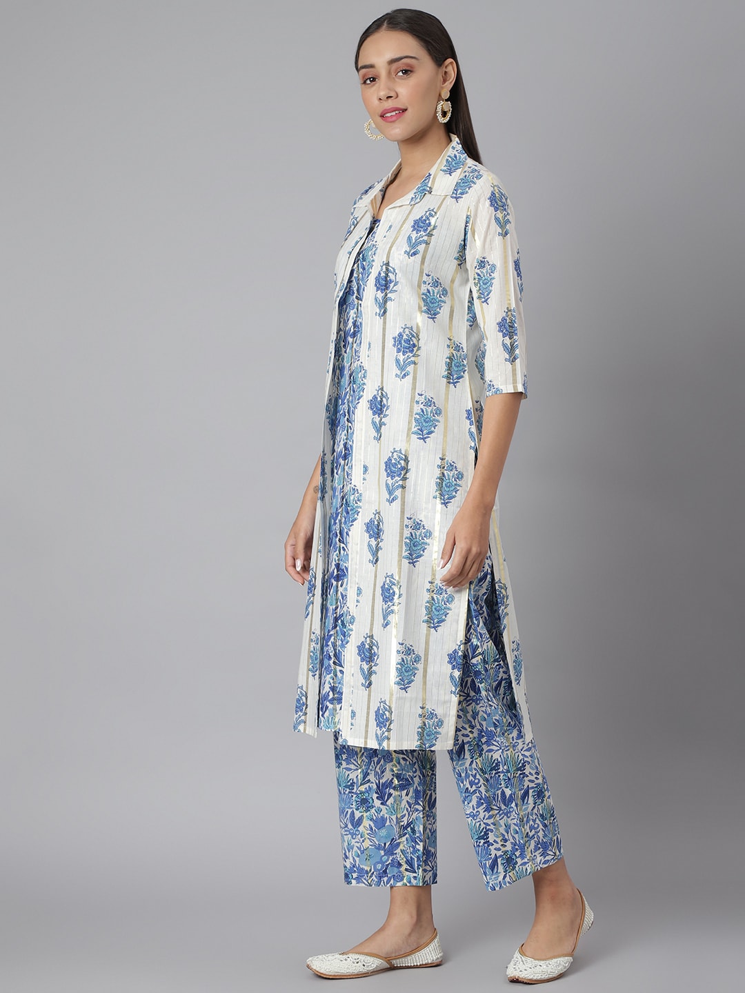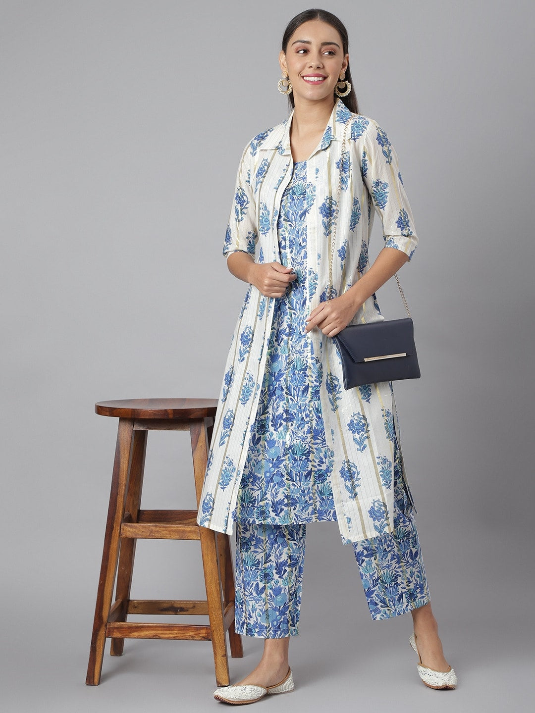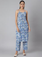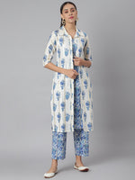Khushal K Women Blue & White Printed Kurta with Palazzos & Jacket