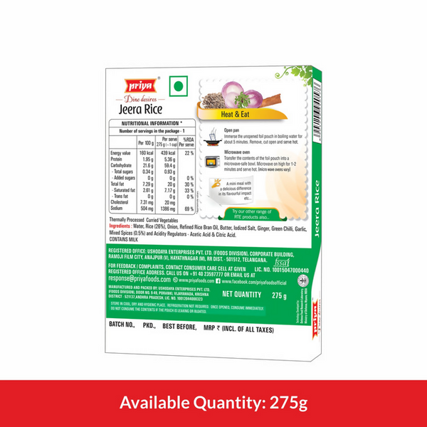 Priya Ready To Eat Jeera RiceAbout the Product:Jeera Rice makes a perfect partner with a variety of dal preparations, spicy gravies and vegetarian ...