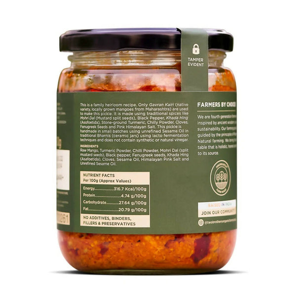 Two Brothers Organic Farms Spicy Mango PickleAbout the Product: Pickle made using native variety mangoes (Gavran Kairi), in Wood-pressed Sesame Oil...