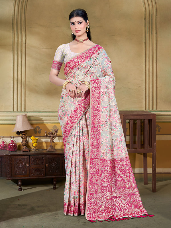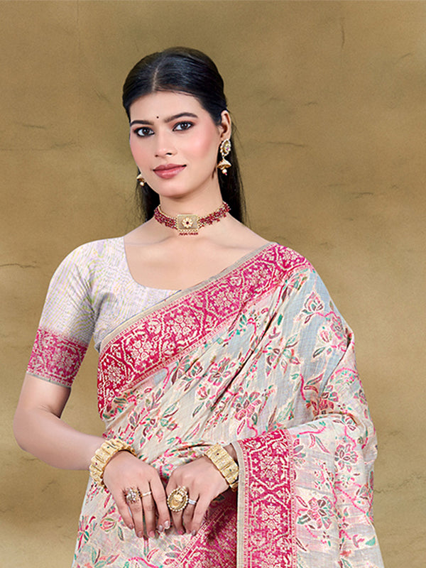 Sangam Prints Cream Cotton Silk With Meena Woven Work Traditional Saree - Free Size