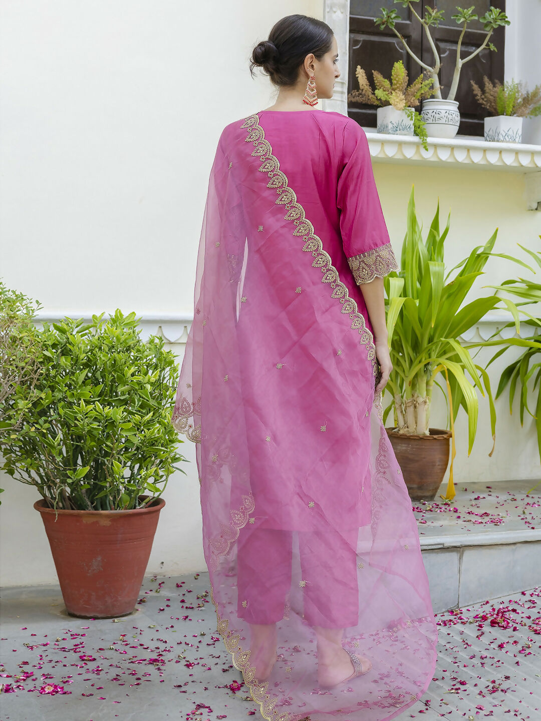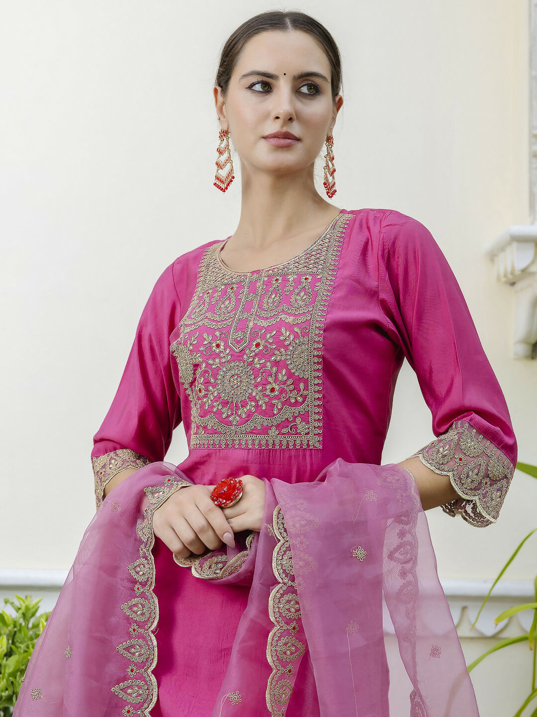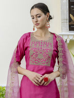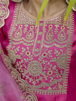 Add a vibrant splash of color to your wardrobe with this rich Rani Pink salwar suit from Vellora. Crafted with intricate embroidery on a premium silk blend fabric, this ready-to-wear suit perfectly balances traditional artistry and everyday comfort. The bright, bold shade of Rani Pink makes it a standout choice for casual outings, festive occasions, or family gatherings. The breathable, lightweight fabric ensures ease of wear throughout the day, while the coordinated bottom and dupatta complete this elegant ensemble with grace. If you want a striking yet comfortable outfit that enhances your ethnic style, this Vellora piece is an excellent pick.