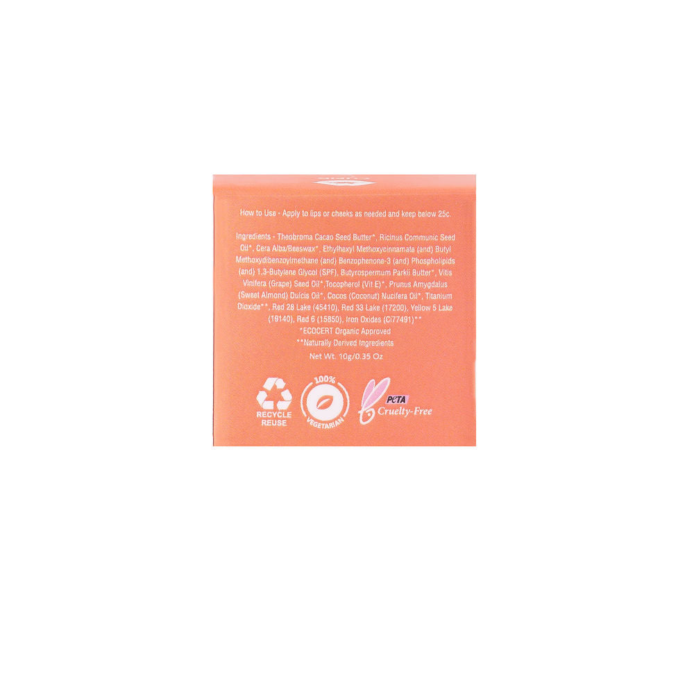 Theobroma Cacao Seed Butter, Ricinus Communic Seed Oil, Cera Alba/Beeswax, Ethylhexyl Methoxycinnamate (and) Butyl Methoxydibenzoylmethane (and) Benzophenone-3 (and) Phospholipids (and) 1,3-Butylene Glycol (SPF), Butyrospermum Parkii Butter, Vitis Vinifera (Grape) Seed Oil, Tocopherol (Vit E), Prunus Amygdalus (Sweet Almond) Dulcis Oil, Cocos (Coconut) Nucifera Oil, Titanium Dioxide, Red 28 Lake (45410), Red 33 Lake (17200), Yellow 5 Lake (19140), Red 6 (15850), Iron Oxides (Ci77491) ECOCERT Organic Approved Naturally Derived Ingredients