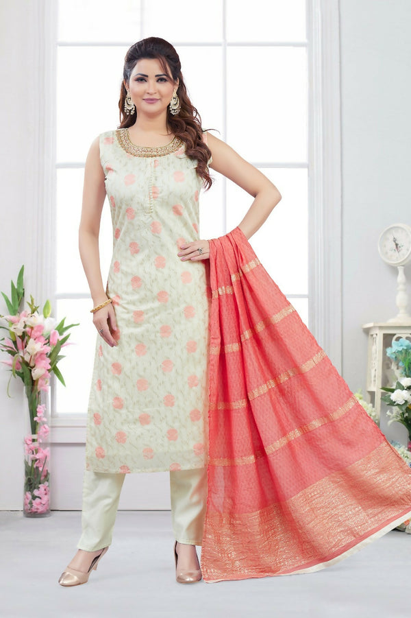 Joban Fashion Jacquard Cream Color Kurta Set Top Color : Cream Lining : Cotton Bottom Color : Cream Dupatta Color : Peach No of Pieces : 3 To...