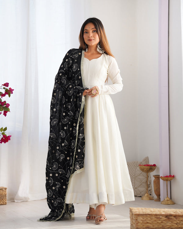 Lorenvalley Fashion White Vichitra Silk Fabric Fully Flared Anarkali Pant With Dupatta Set
