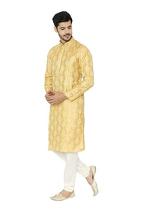 Manyavar Mustard yellow Embroidered Knee Long Full Sleeves Kurta and Churidar Set For Men