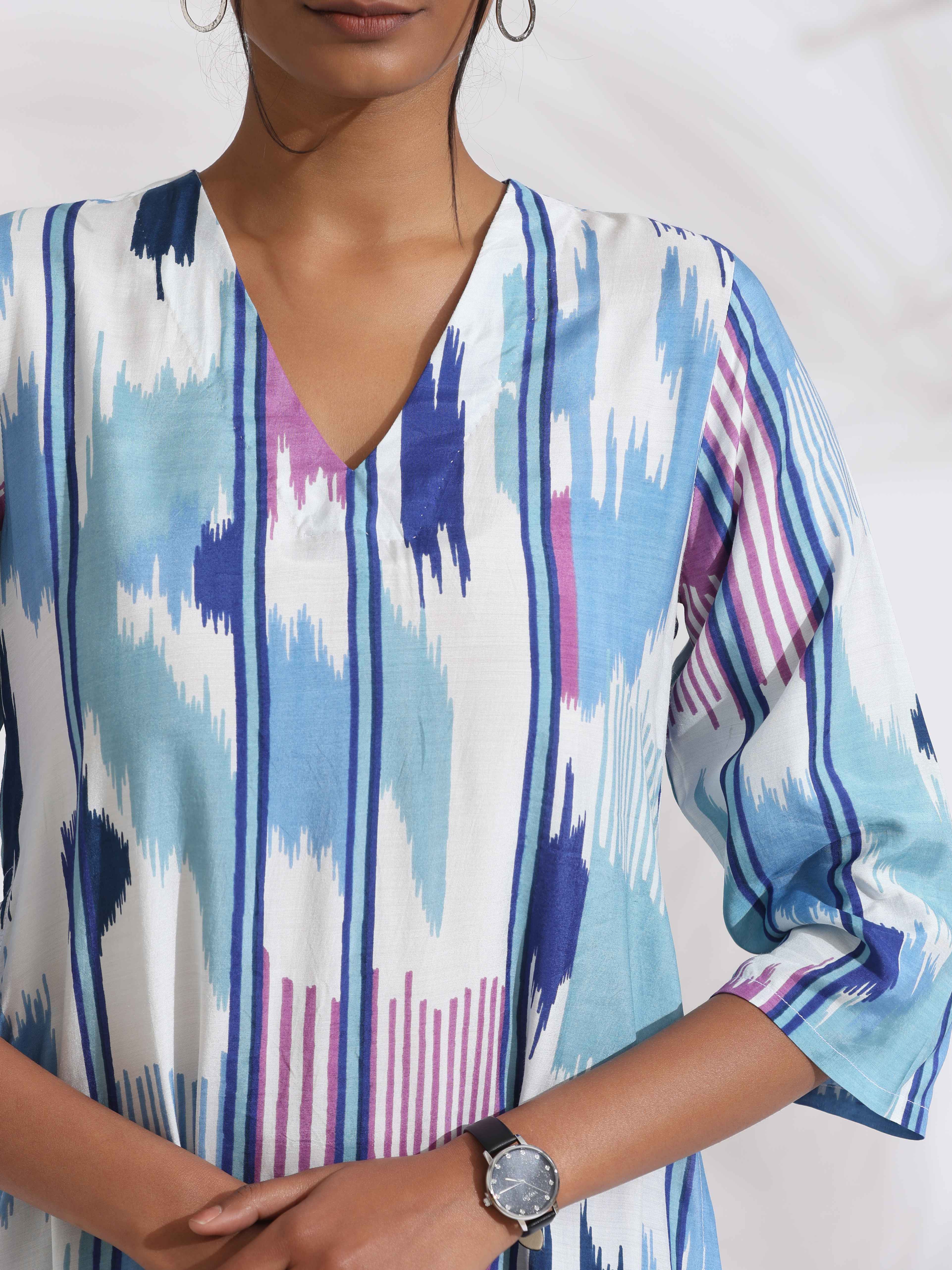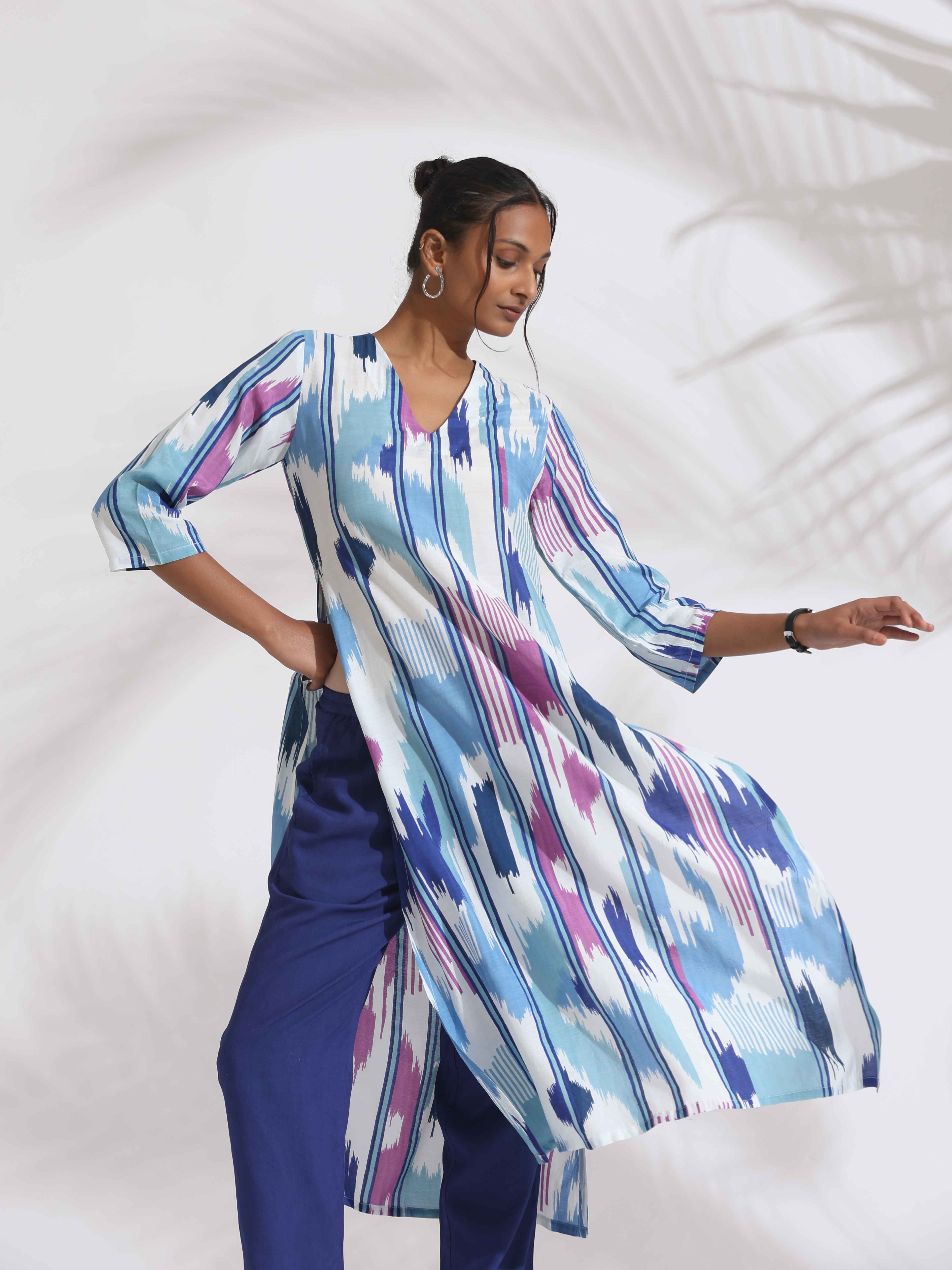 trueBrowns Blue Ikat Print Muslin Kurta SetDescription Elevate your style with this ikat print kurta, featuring a V- neckline and high slit for a m...