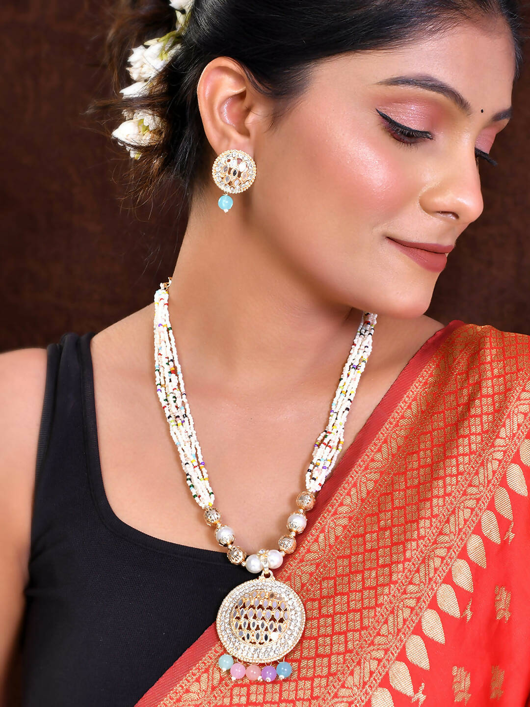 Introducing our enchanting Gold-Plated and White Pearl Kundan Multi-Color Beaded Jewellery Set, a blend of opulence and charm. This set features intricately designed pieces with a combination of white pearls, Kundan accents, and multi-color beads, creating a mesmerizing and vibrant look. The gold-plated finish adds a touch of luxury, while the matching earrings complete the ensemble with elegance. Elevate your style with this versatile and eye-catching jewellery set, perfect for adding a statement to any outfit.