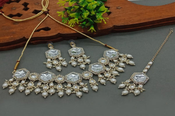 Jewel City Elegant Kundan-Style White and White Necklace, Earrings, and Tikka Set
