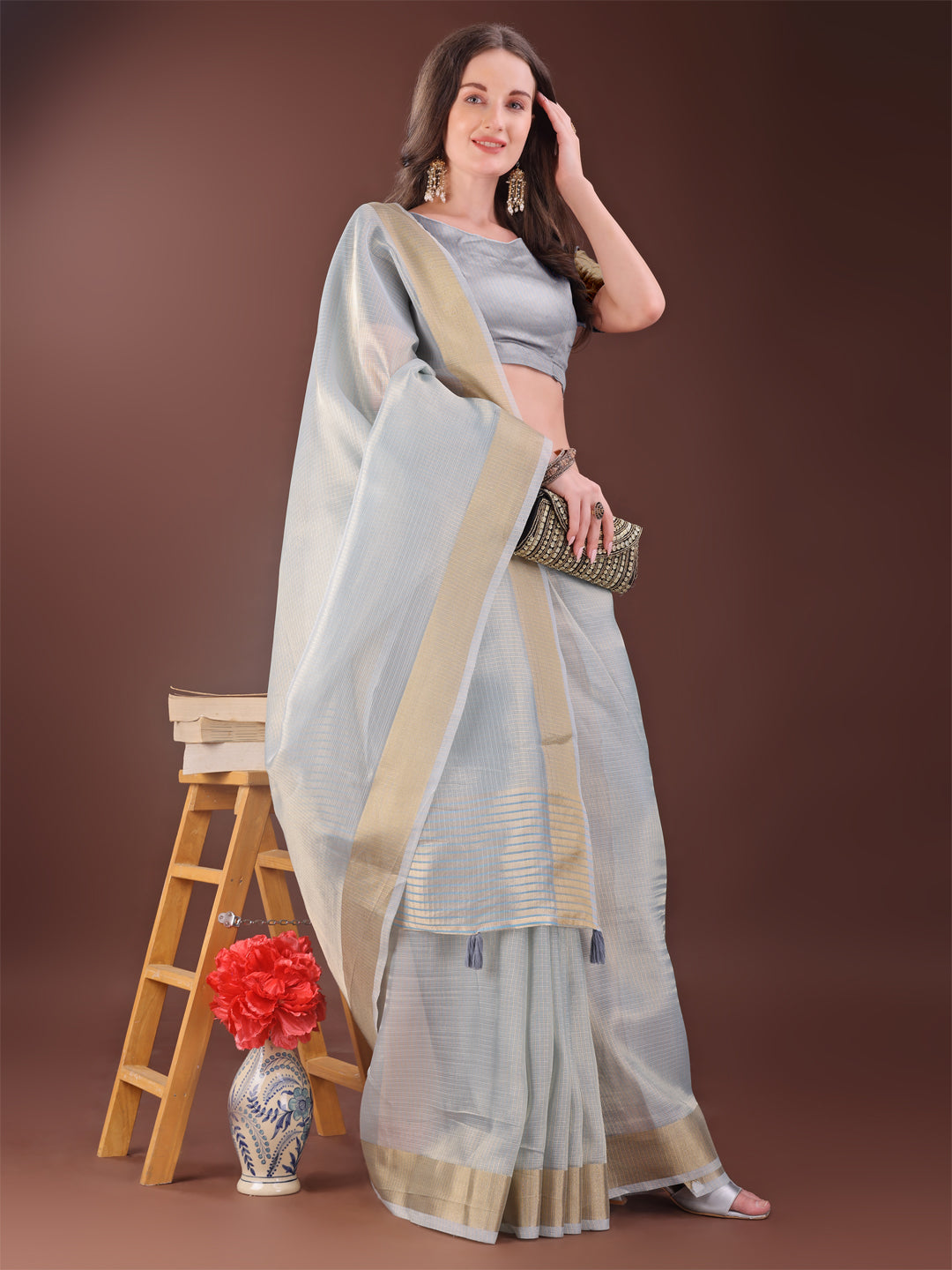 Astita Elegant Grey Organza Saree with Zari Border | Lightweight Transparent Saree with Blouse Piece for Festive & Daily Wear - Distacart