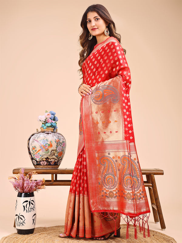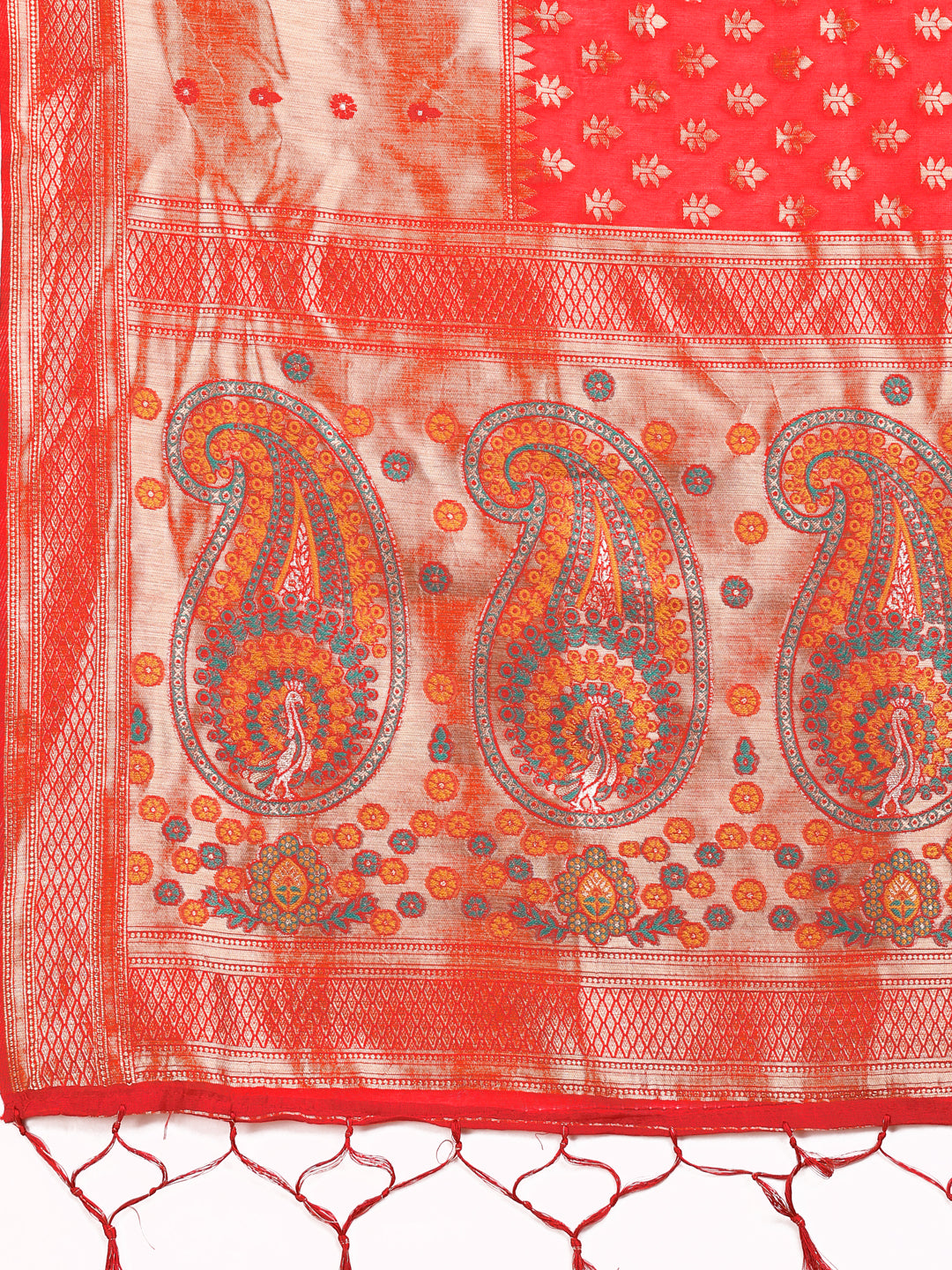 Wrap yourself in tradition and trend with this timeless red and beige linen cotton saree, enriched with royal paisley motifs and golden zari accents. Light in feel and grand in look, it's the perfect fusion of comfort and sophistication.