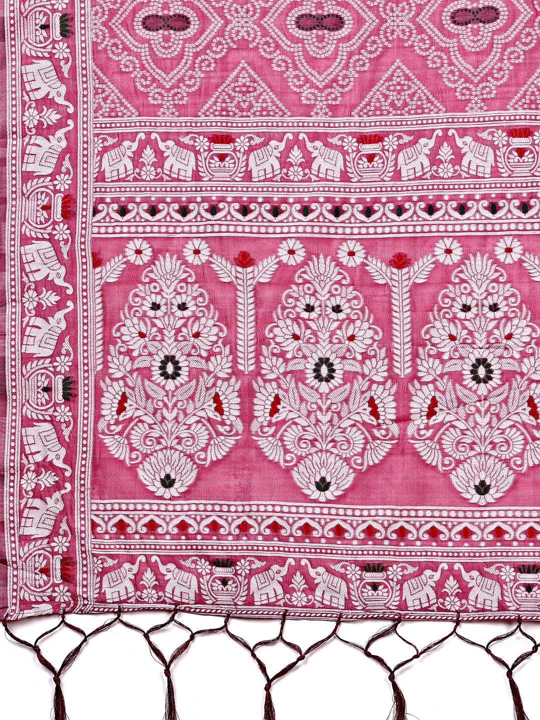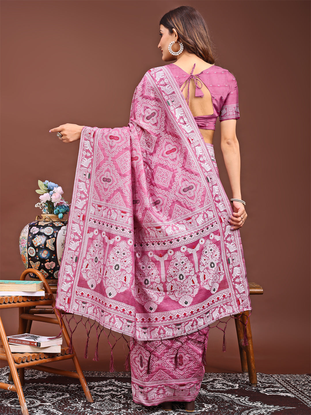 This pink printed saree is more than a piece of fabric—it's a feeling wrapped in tradition. A companion for your everyday grace and treasured memories, it’s crafted for the woman who cherishes elegance in simplicity.