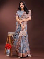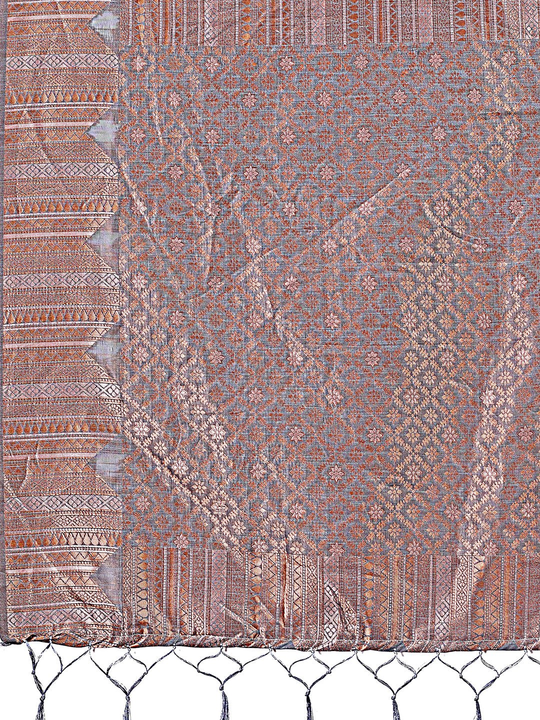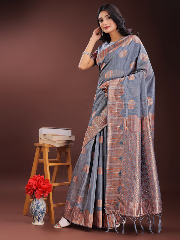 Astita Grey Linen Cotton Saree with Woven Geometric Zari Motifs - Elegant Festive Wear for Women - Distacart