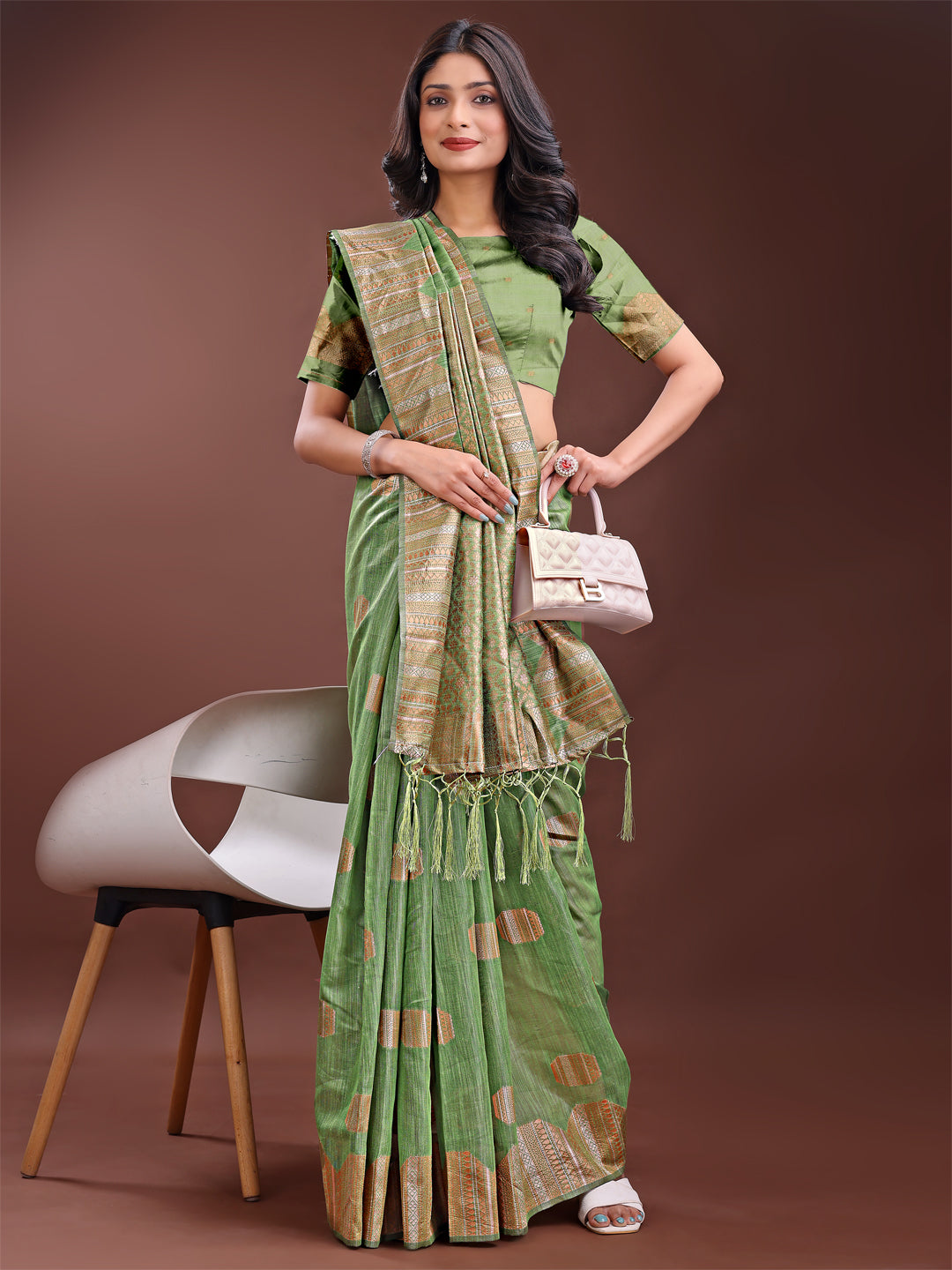 Astita Light Green Linen Cotton Saree with Woven Geometric Zari Motifs - Elegant Festive Wear for Women - Distacart